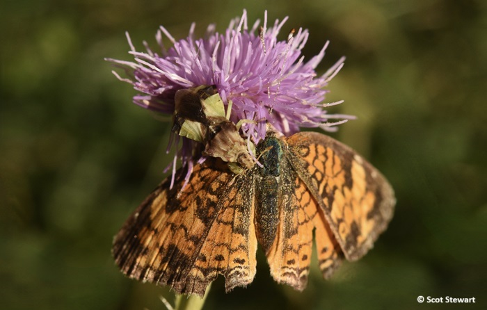 Jagged Ambush Bug with Pearl Crescent, Wisconsin