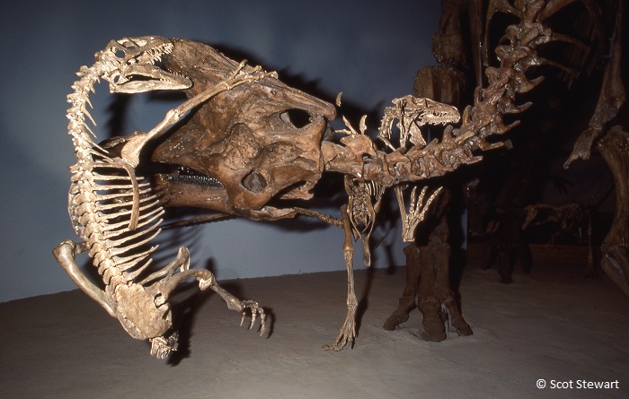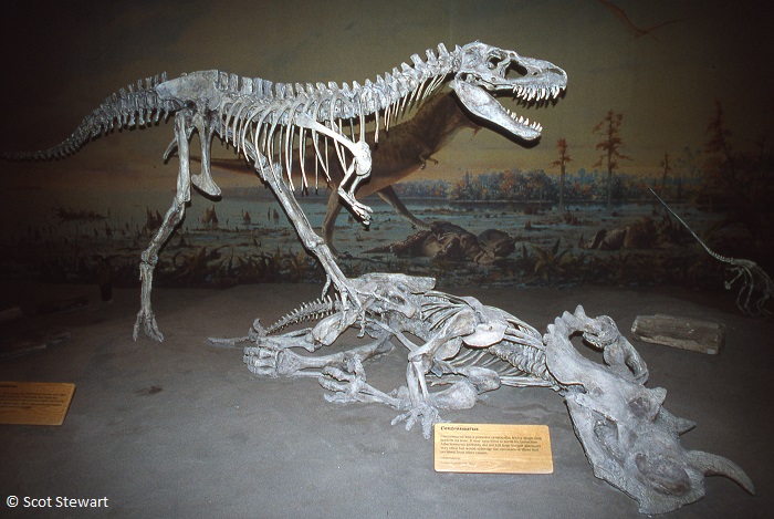 Albertosaurus Dinosaur Attack Triceratops with Skeletons, Dinosaur Provincial Park, Alberta, Canada