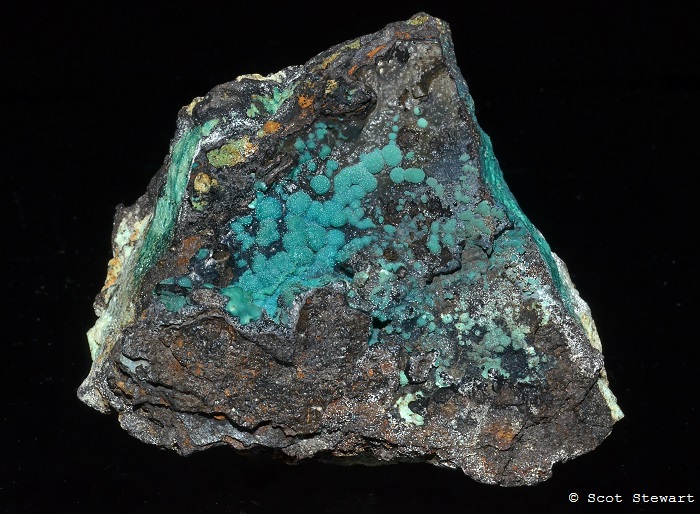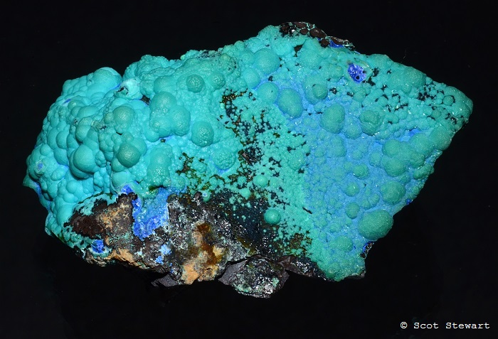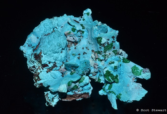 Chrysocolla Cu2-xAlx(H2xSi2O5)(OH)4-nH2O (x<1)11>, with Malachite and Cornetite, L'Etoile du Congo Mine, Lubumbashi, Katanga, Democratic Republic of Congo