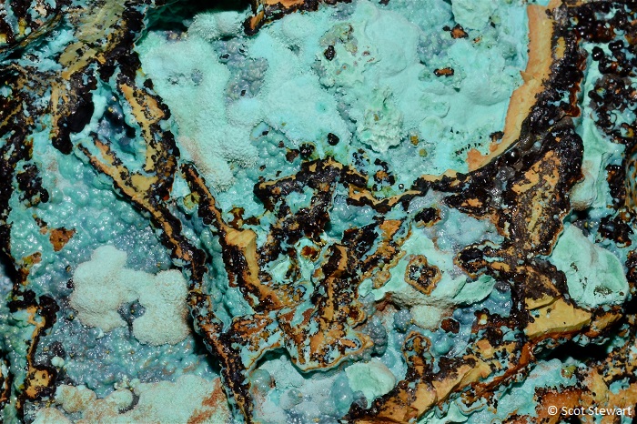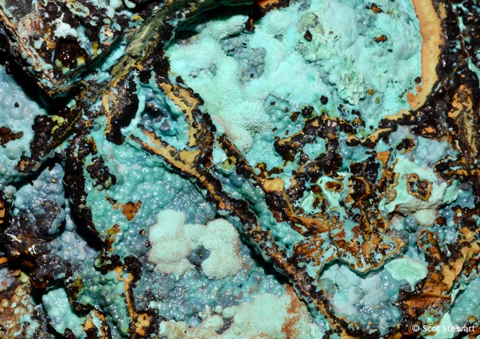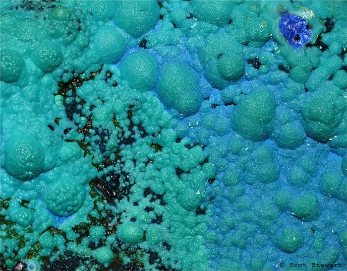 Chrysocolla Cu2-xAlx(H2xSi2O5)(OH)4-nH2O (x<1)11>, detail with Azurite (blue), Morenci Mine, Greenlee Co., Arizona