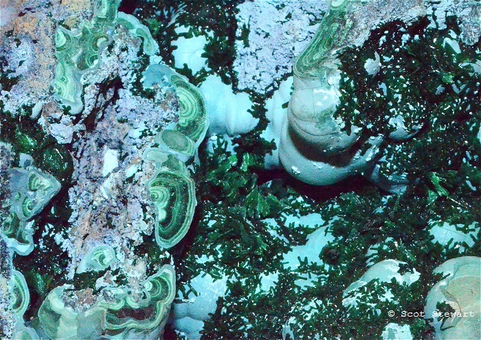 Chrysocolla Cu2-xAlx(H2xSi2O5)(OH)4-nH2O (x<1)11>, with Malachite, Morenci Mine, Greenlee Co., Arizona