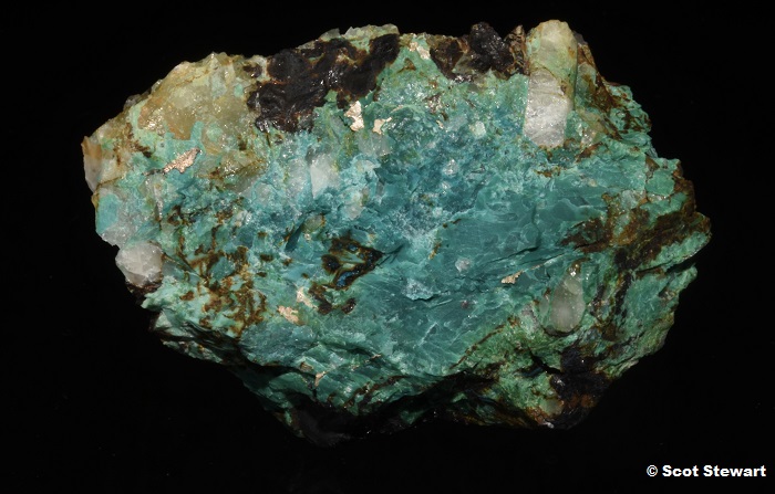 Chrysocolla Cu2-xAlx(H2xSi2O5)(OH)4-nH2O (x<1)11>, with Silver and Quartz, Black Pine mine, Granite Co., Montana