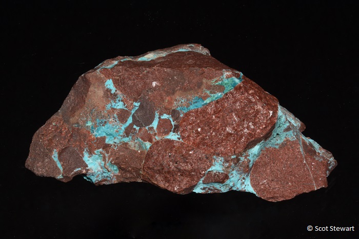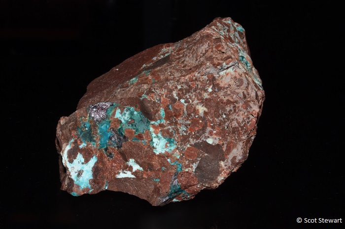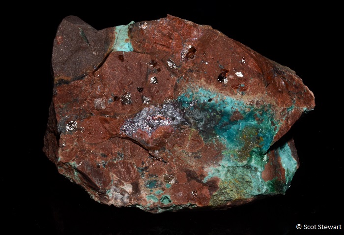 Chrysocolla Cu2-xAlx(H2xSi2O5)(OH)4-nH2O (x<1)11>, with Cuprite in Copper Harbor Conglomerate, Allouez Mine, Keweenaw Co., Michigan