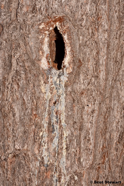 Eastern White Pine Pinus strobus Bark Detail with Pileated Woodpecker Hole