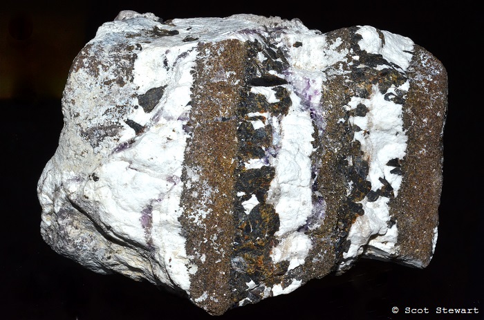 Fluorite CaF2, with Calcite and Sphalerite, under SW UV Light, Anna Belle Lee Mine, Hardin Co., Illinois
