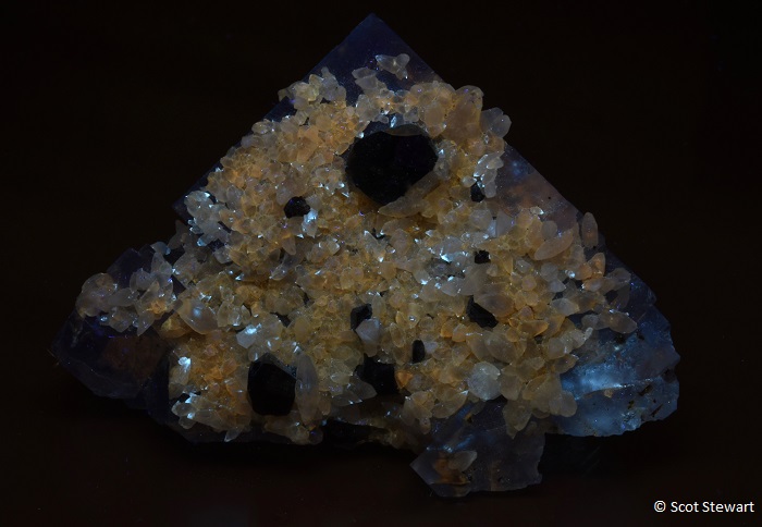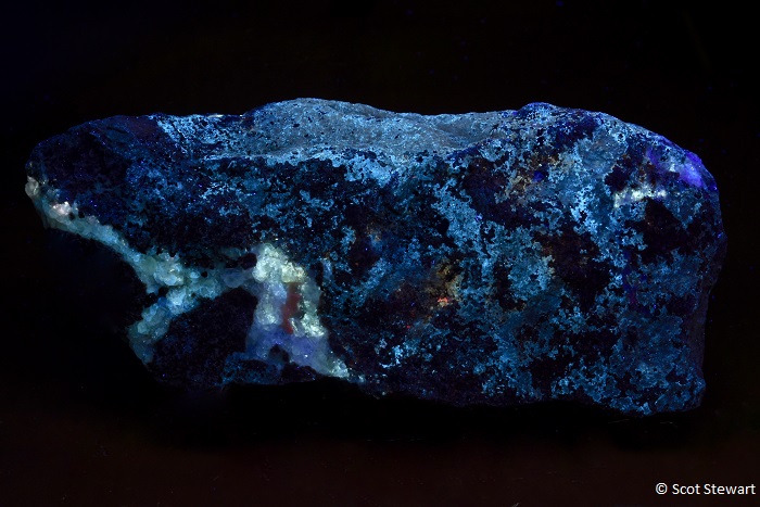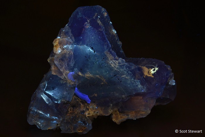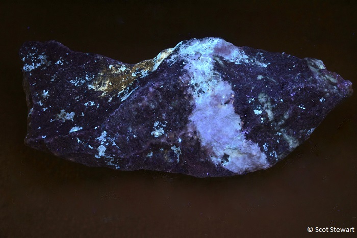 Fluorite CaF2 with Sphalerite, under SW UV Light, Minerva Mine, Hardin Co., Illinois
