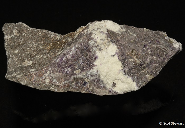 Fluorite CaF2, with Calcite and Sphalerite, reverse of previous specimen, under SW UV Light, Anna Belle Lee Mine, Hardin Co., Illinois