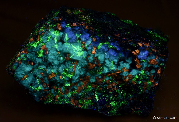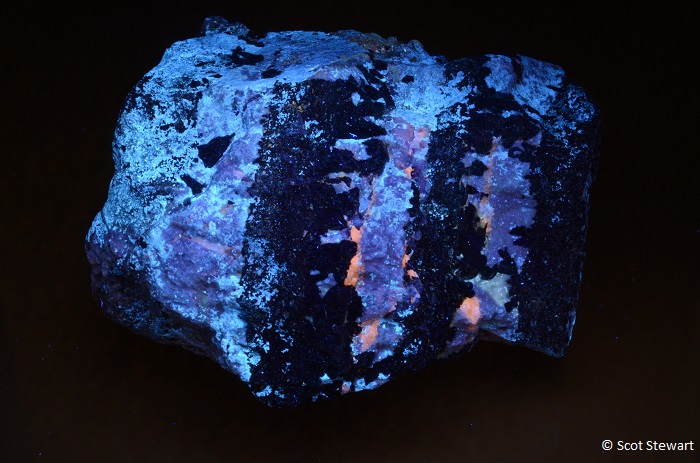 Fluorite CaF2 (blue) with Fluorapatite (orange) and Willemite (green), Under SW UV Light, Franklin, Sussex Co., New Jersey