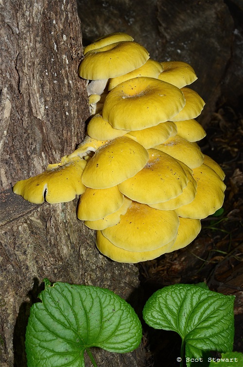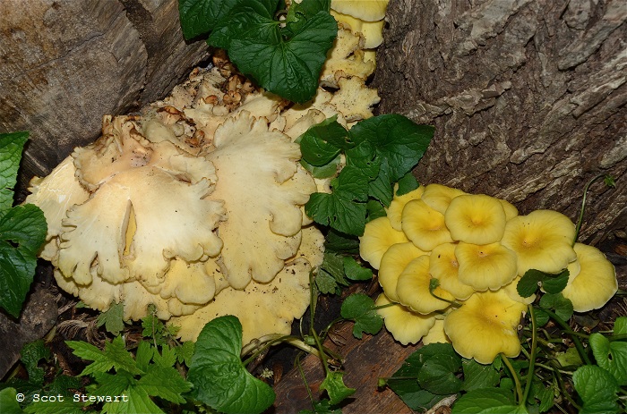 Yellow Oyster Mushroom Pleurotus citrinopileatus? right, with ?, Iowa