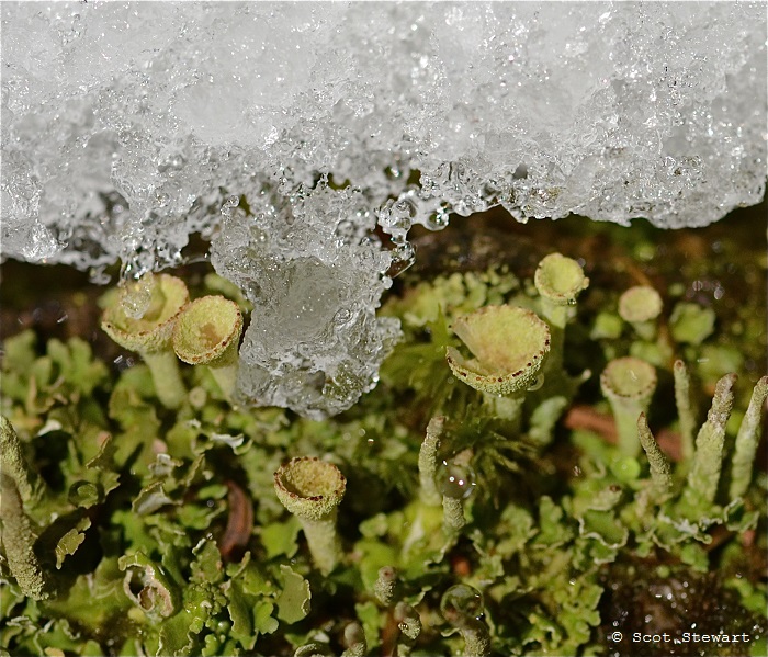 Fairy Cup Lichen Cladonia pyxidata with melting snow, Michigan