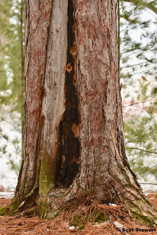 Red Pine Pinus resinosa, Trunk with Fire Damage and Woodpecker Holes, Marquette Co., Michigan January