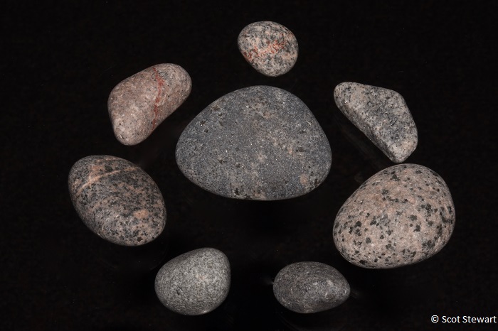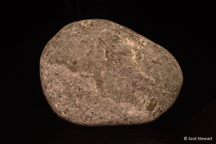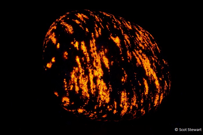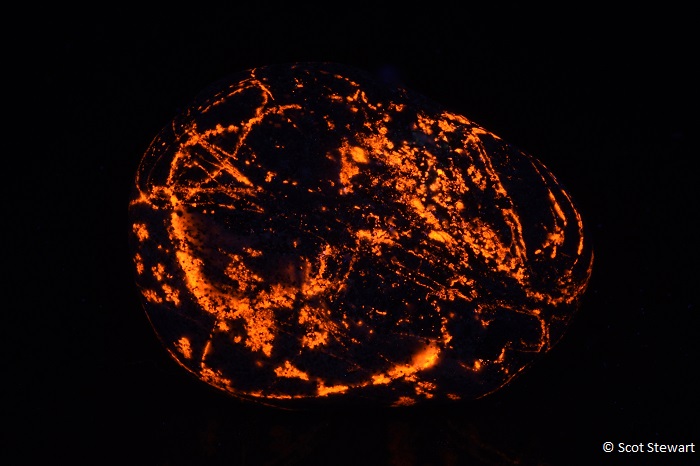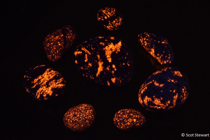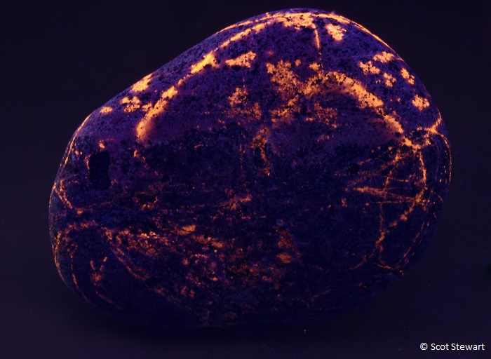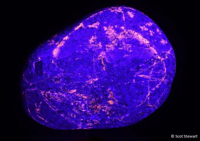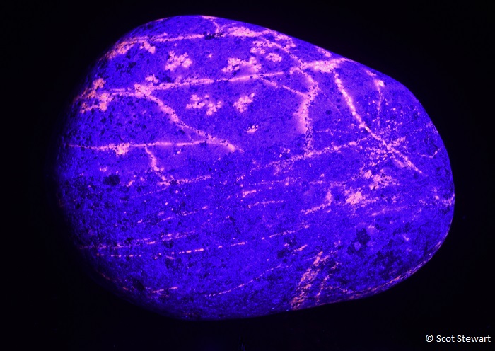 Sodalite - Yooperlight, NaAl6Si6O24Cl2 in Syenite, under SW Ultraviolet light, Lake Superior Beach, Marquette Co., Michigan
