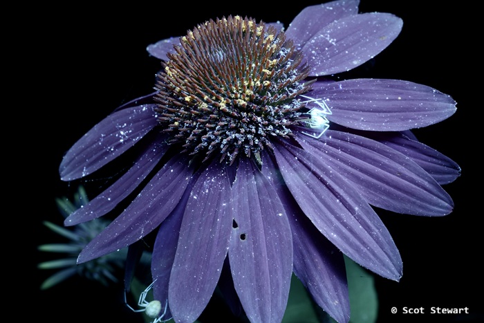 Common Candy-striped Spider running on a Purple Coneflower fast enough to appear twice in long exposure.