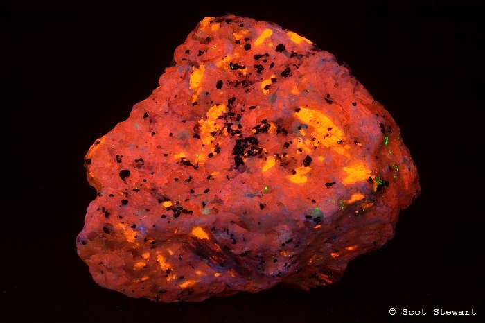 Wollastonite, CaSiO3,(gold) under Shortwave UV, with Calcite, (red), Barite (white), Franklinite (nonfluorescent), and minor Willemite, (green), Franklin, Sussex Co., New Jersey