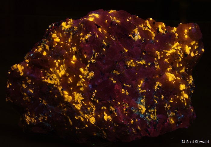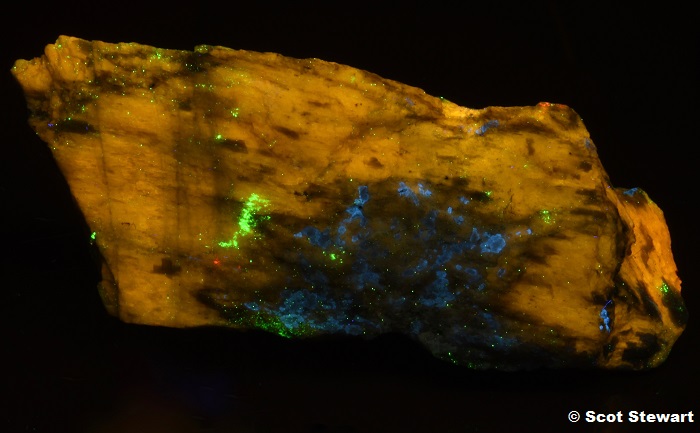 Wollastonite CaSiO3 yellow with Hardystonite (blue) and Willemite (green), under Shortwave UV light, Sterling Hill Mine, Ogdensburg, Sussex Co., NJ